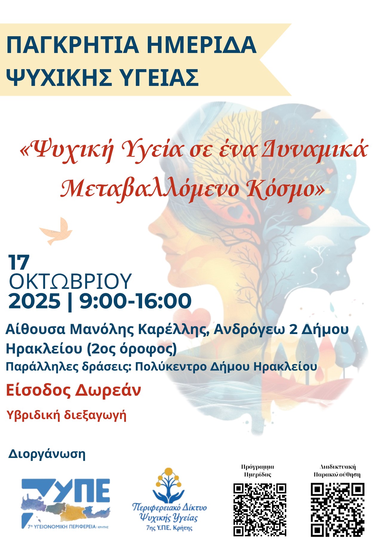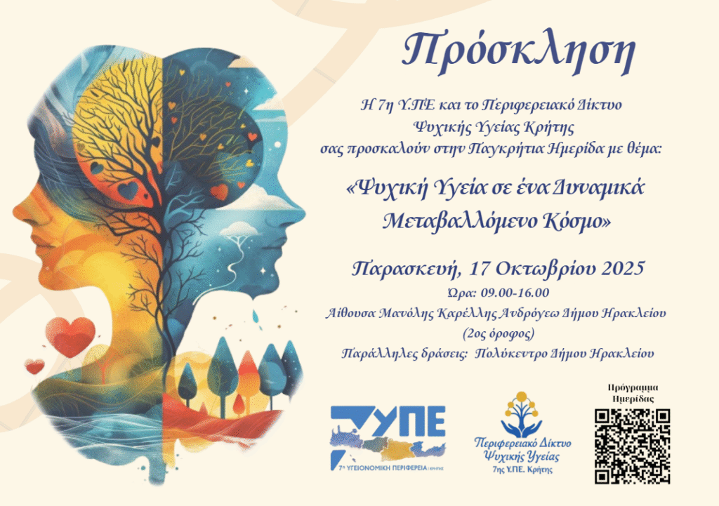 Στο πλαίσιο της Παγκόσμιας Ημέρας Ψυχικής Υγείας 2025, η 7η Υ.Πε Κρήτης και το Περιφερειακό Δίκτυο Υπηρεσιών Ψυχικής Υγείας ευθύνης της, διοργανώνουν Ημερίδα, την Παρασκευή 17 Οκτωβρίου 2025, με θέμα: «Ψυχική Υγεία σε ένα Δυναμικά Μεταβαλλόμενο Κόσμο».