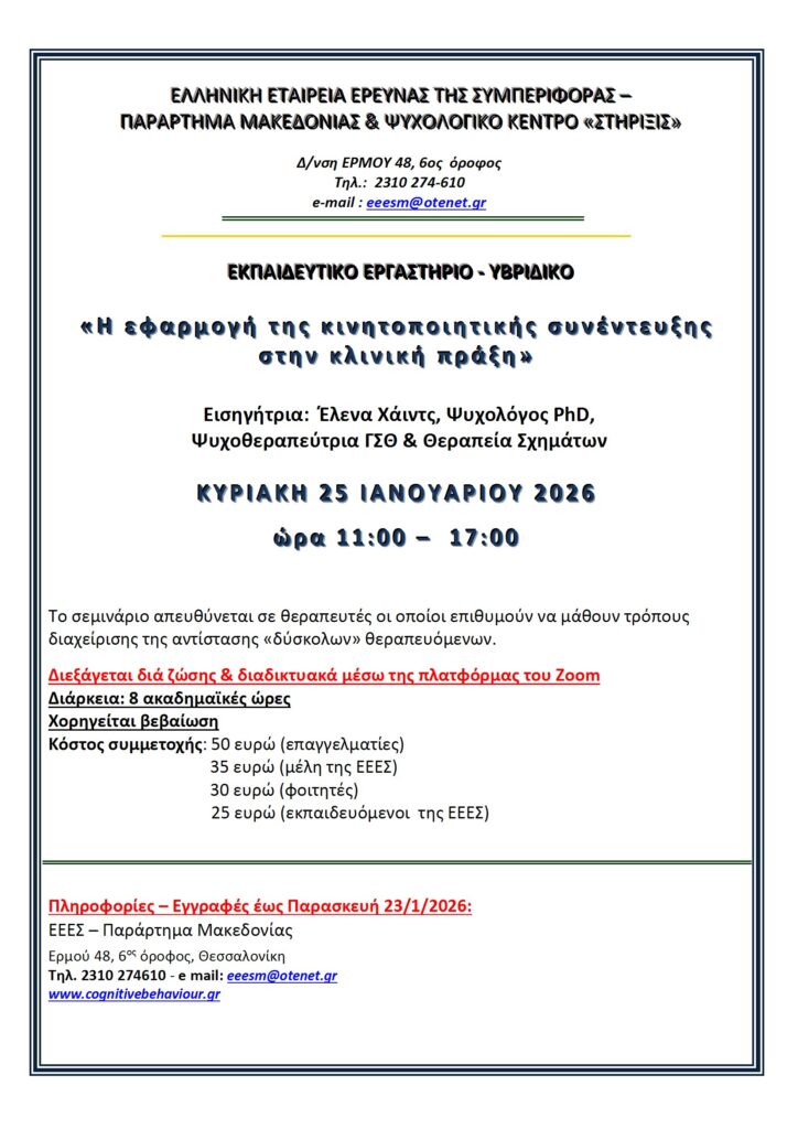 Στόχος του εργαστηρίου είναι να παρουσιασθεί το θεωρητικό πλαίσιο του συγκεκριμένου είδους συνέντευξης και ο τρόπος εφαρμογής του σε διάφορες περιοχές της ψυχοπαθολογίας [διατροφικές διαταραχές, αποφευκτικό άγχος, εξαρτήσεις, κ.λ.π.]