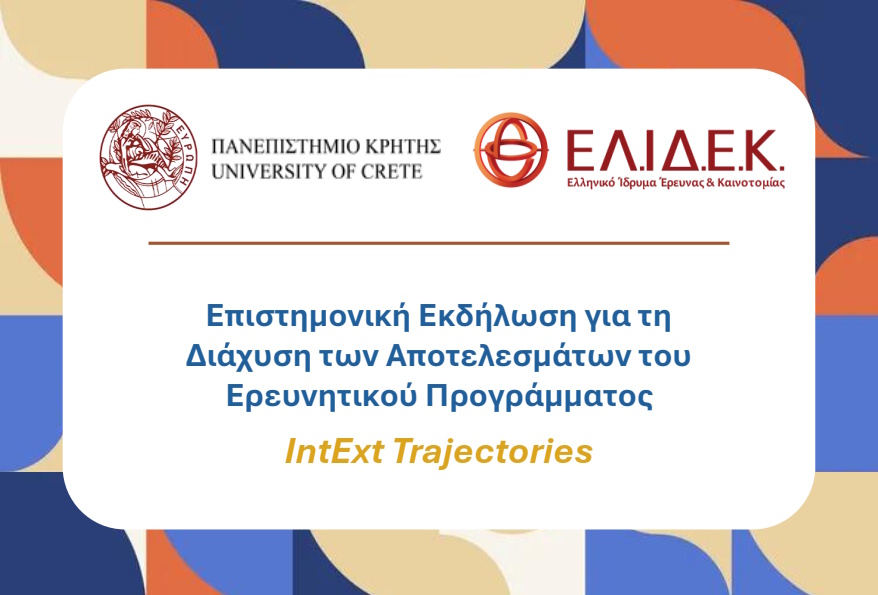 Αγαπητοί/ές συνάδελφοι και συνεργάτες, Στο πλαίσιο της διάχυσης των αποτελεσμάτων του ερευνητικού προγράμματος IntExt Trajectories που χρηματοδοτείται από το ΕΛ.Ι.Δ.Ε.Κ και υλοποιείται από το Τμήμα Ψυχολογίας σε συνεργασία με τον Τομέα Κοινωνικής Ιατρικής, Ιατρική Σχολή, Πανεπιστήμιο Κρήτης και τη Μελέτη Μητέρας – Παιδιού Κρήτης (Μελέτη ΡΕΑ) διοργανώνονται δύο επιστημονικές εκδηλώσεις στις πόλεις του Ρεθύμνου και […]